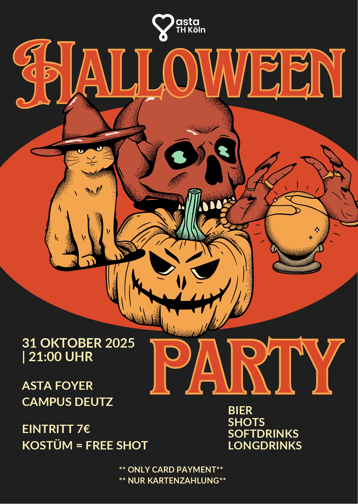 Am 31.10. ist es endlich soweit, wir feiern unsere Halloween Party im AStA Foyer in Deutz.